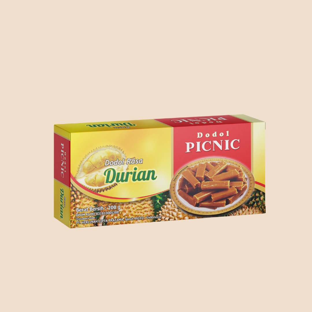 Nikmati sensasi kelezatan tropis dari Dodol Garut Picnic Rasa Durian, varian istimewa yang memadukan lembutnya dodol tradisional dengan aroma khas durian yang kuat dan menggugah selera. Setiap gigitan menghadirkan rasa manis legit dengan cita rasa durian asli yang nikmat tanpa berlebihan.