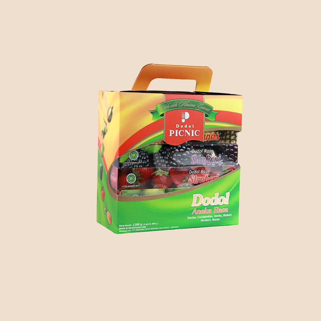 Dodol Garut PICNIC Special Gift 1200 AB, dengan 6 Rasa didalamnya yaitu Cocopanda, Durian, Stroberi, Blueberi, Nanas dan Jambu. Cocok dijadikan oleh-oleh atau hantaran di momen momen penting bersama kerabat maupun keluarga